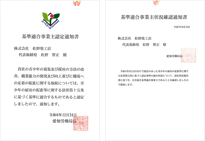 佐野塗工店では、若手社員の人材育成に取り組んでおり、この度「ユースエール認定企業(*)」として令和6年12月24日認定されました。